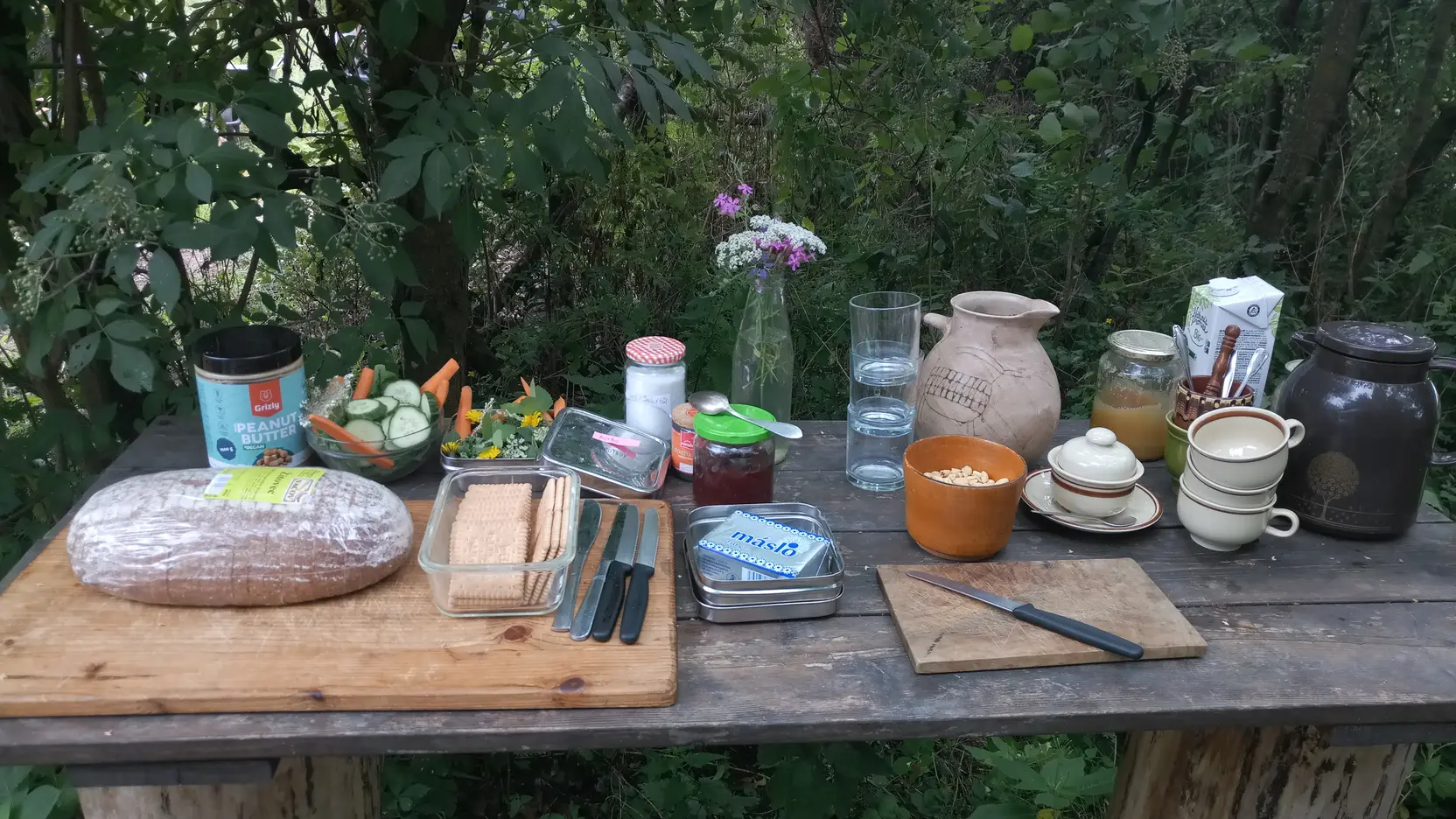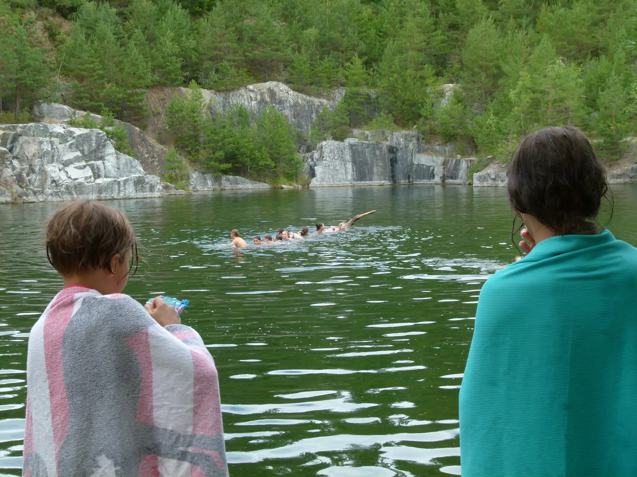 Na velký výletní den bylo dopoledne vytoužené počasí na koupání. Voda byla poměrně chladná, ale osvěžení přišlo všem vhod. Právě když byl poslední ještě ve vodě, začalo opět mrholit, a tak jsme rychle sbalili věci a vydali se na cestu domů. Naštěstí byla cesta zpět suchá. Autobusy však jezdily tak zřídka, že jsme mohli jet jen jednu zastávku. Cestou jsme mohli ochutnat sem tam nějaké sladké, zralé mirabelky. Houby, které jsme našli (obří pýchavky), skončily po návratu domů na pánvi a byly doplněny o parasolky, které jsme nasbírali bosýma nohama z kopřiv. K večeři jsme kvůli neustávajícímu dešti opět jedli v jurte, a to s proso a alternativní omáčkou bez hub.
