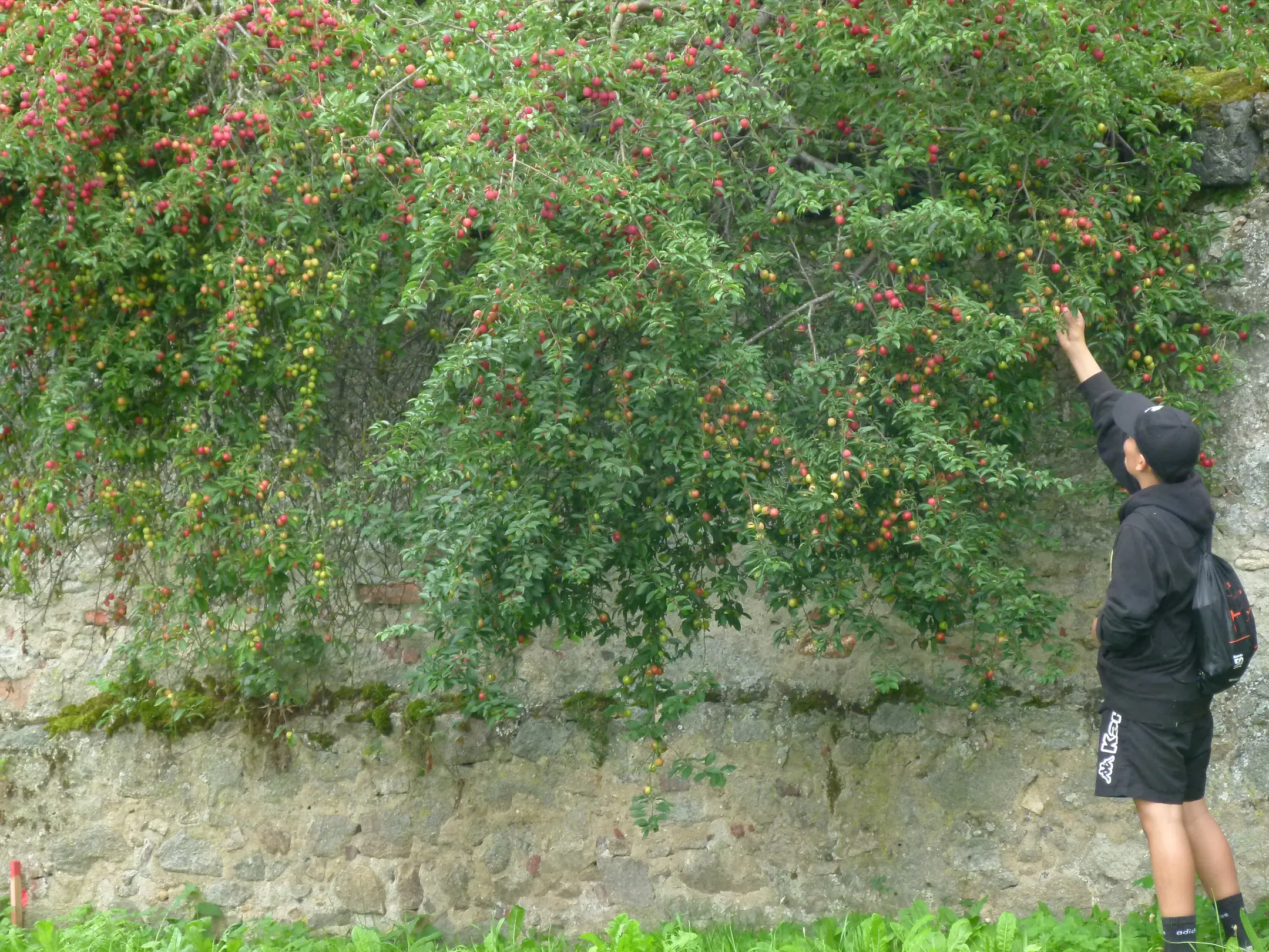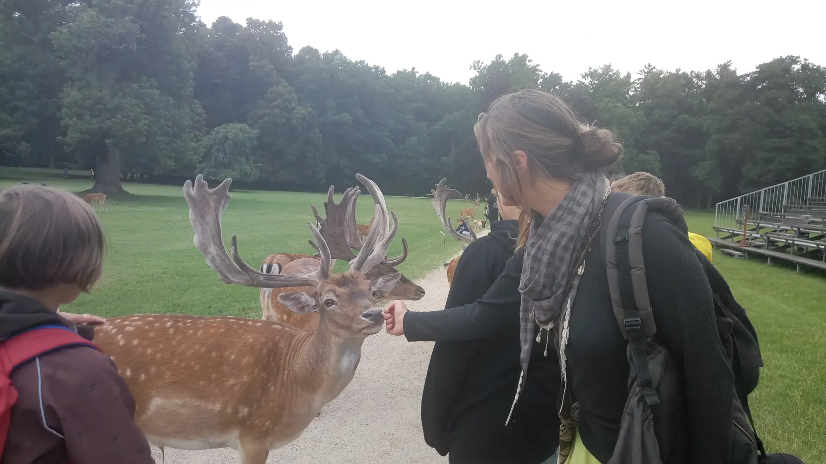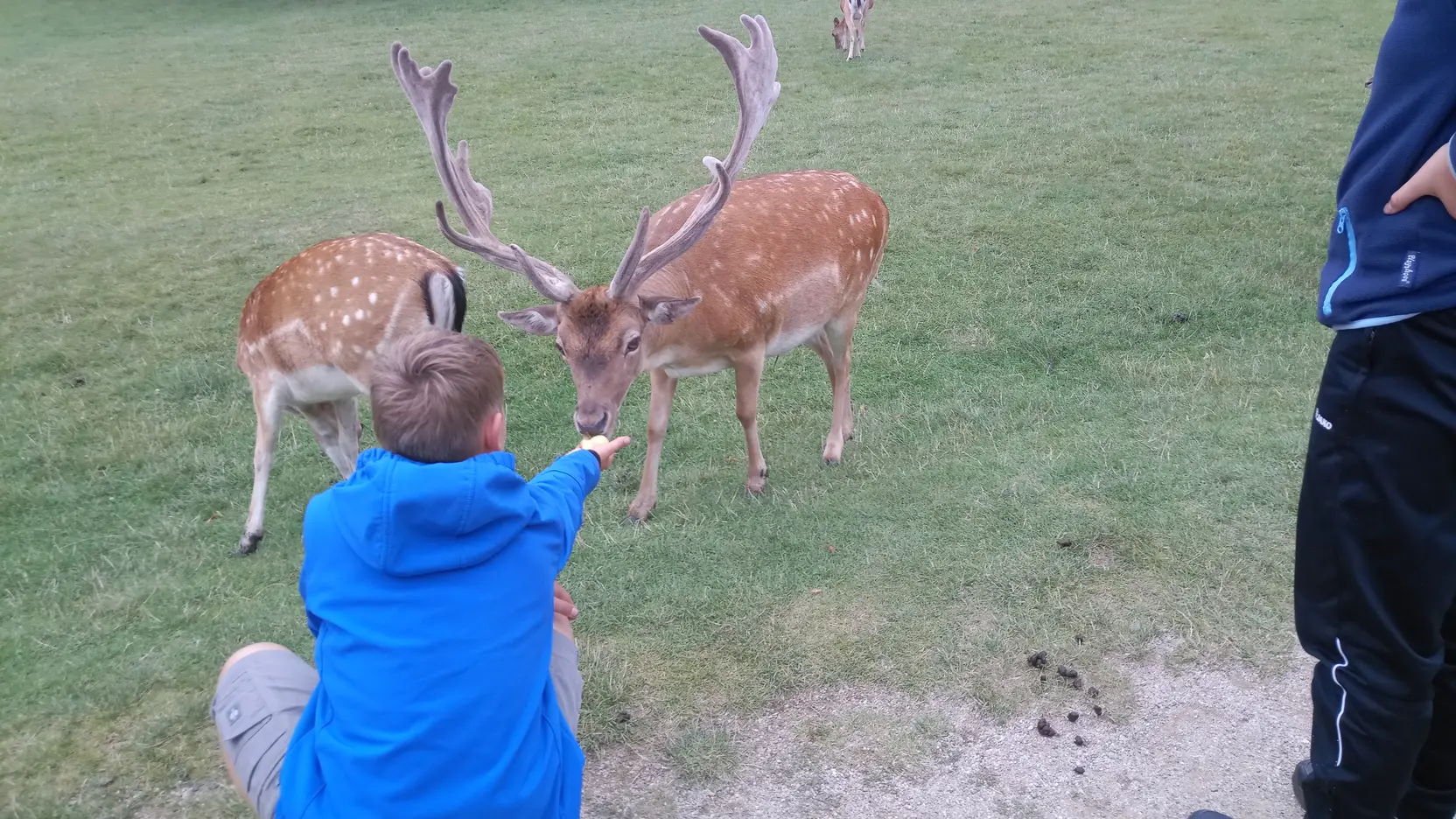 Am nächsten Vormittag hörte man es von unten Hämmern und Klopfen und oben im berühmten Baumkreis der mehrstöckigen Hängematten wurde sich lebhaft unterhalten. Mittags starteten wir dann zum Stadtausflug. Die Kleinstadt bietet einen pompösen Asia-Supermarkt, der einfach alles hat, solange es nur bunt genug ist, u.a. einen bei Kindern sehr beliebten, fragwürdigen Schleim, der nach Spülmittel riecht und in jeder Hinsicht geschmacklos ist. Aber der Laden hatte auch Umlenkrollen und Seile für den Flaschenzug des Baumhauses. Sehr beeindruckend waren die Rothirsche des Schlossparks, welche die Kinder mit den Äpfeln fütterten, die sie unterwegs gesammelt hatten. Sie laufen dort frei im Park und ließen sich sogar streicheln.