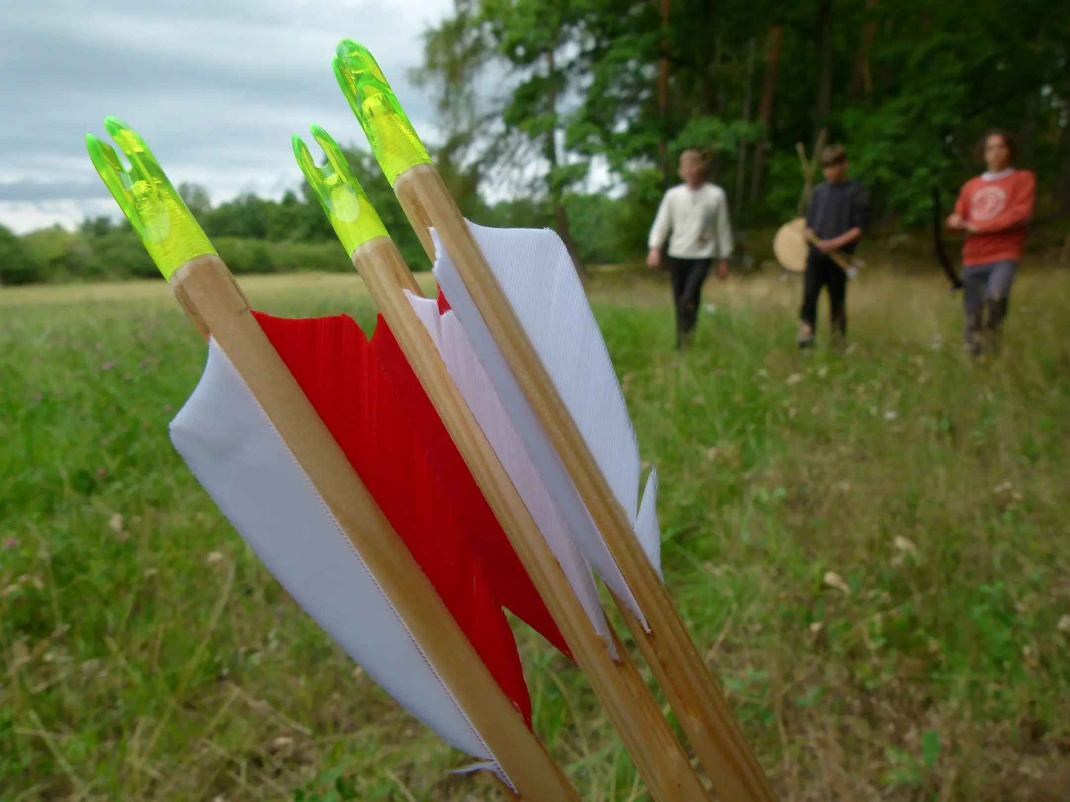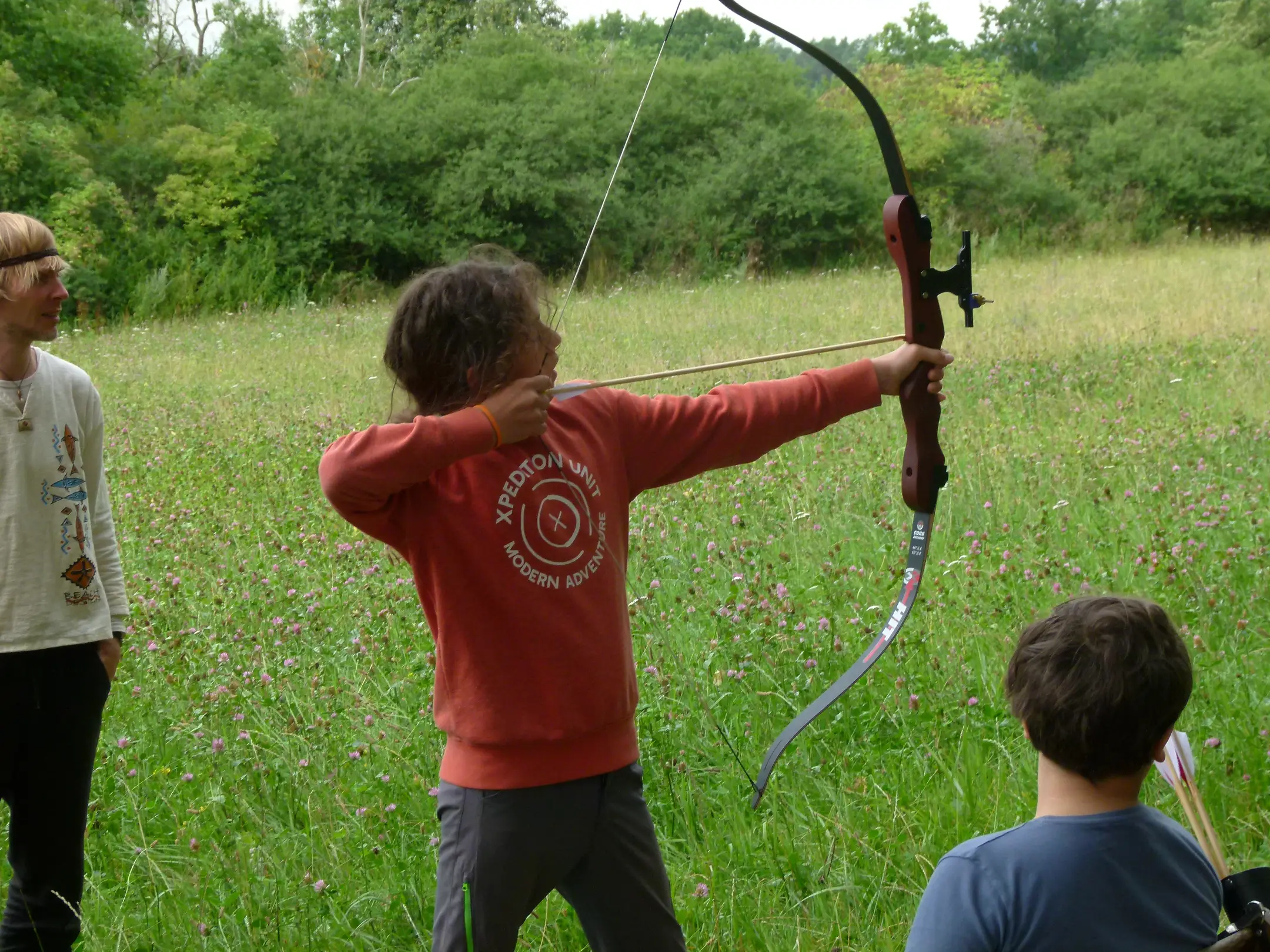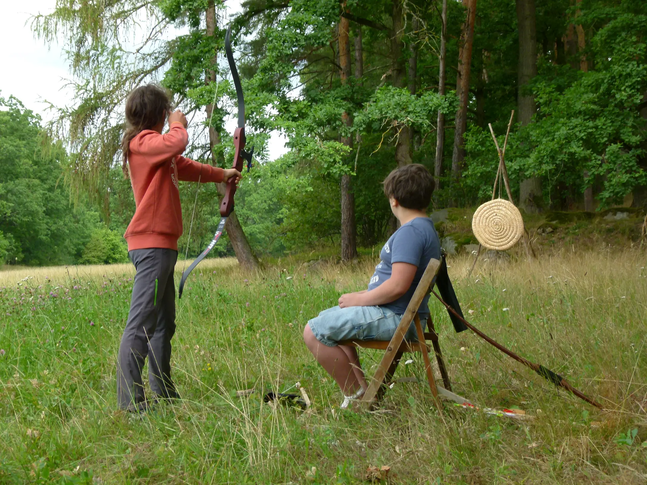 Po snídani u ohně bylo počasí navzdory dešti vhodné pro lukostřelbu na okraji lesa. Někteří měli s sebou vlastní luky, od sportovních luků až po ručně vyřezávané luky, bylo na co se dívat. Poté se pilně stavěla stromový dům a bouda. Odpoledne téměř nepřetržitě pršelo, když jsme navštívili místní vesnickou slavnost. Tam jsme dostali nejlepší ručně grilované hamburgery, neidentifikovatelnou červenou limonádu a s trochou trpělivosti i hranolky. Dechová kapela byla popsána jako „vůbec ne špatná jako doprovodná hudba“. Několik dětí si nechalo namalovat obličej a k dispozici bylo neomezené množství mýdlových bublin a balónků. Ať už pršelo nebo ne, byla to zábava.