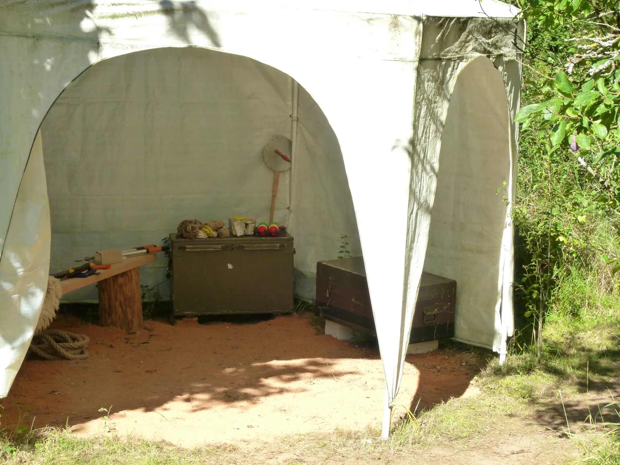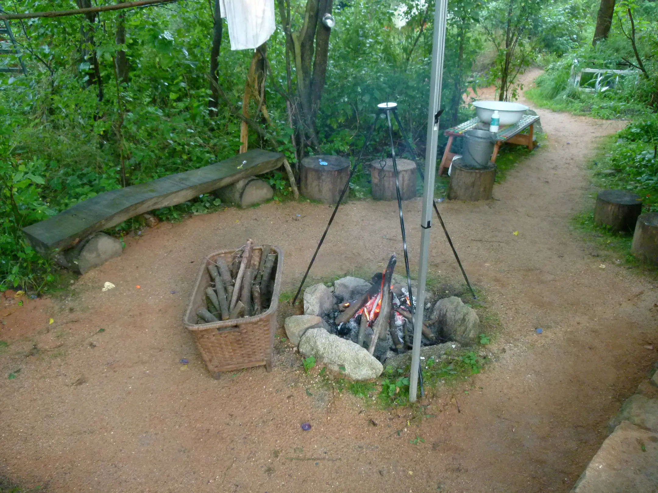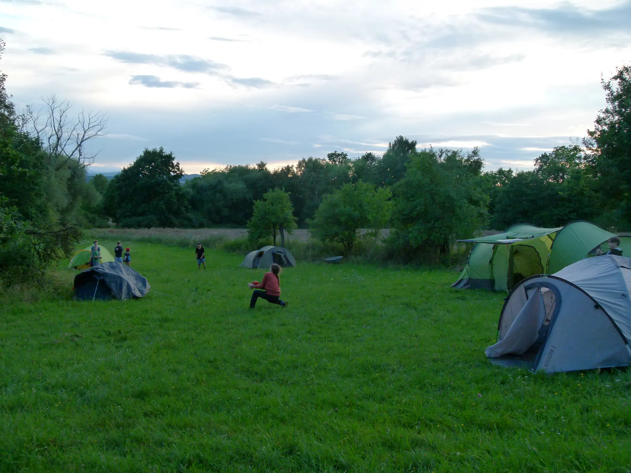 Po snídani u ohně bylo počasí navzdory dešti vhodné pro lukostřelbu na okraji lesa. Někteří měli s sebou vlastní luky, od sportovních luků až po ručně vyřezávané luky, bylo na co se dívat. Poté se pilně stavěla stromový dům a bouda. Odpoledne téměř nepřetržitě pršelo, když jsme navštívili místní vesnickou slavnost. Tam jsme dostali nejlepší ručně grilované hamburgery, neidentifikovatelnou červenou limonádu a s trochou trpělivosti i hranolky. Dechová kapela byla popsána jako „vůbec ne špatná jako doprovodná hudba“. Několik dětí si nechalo namalovat obličej a k dispozici bylo neomezené množství mýdlových bublin a balónků. Ať už pršelo nebo ne, byla to zábava.