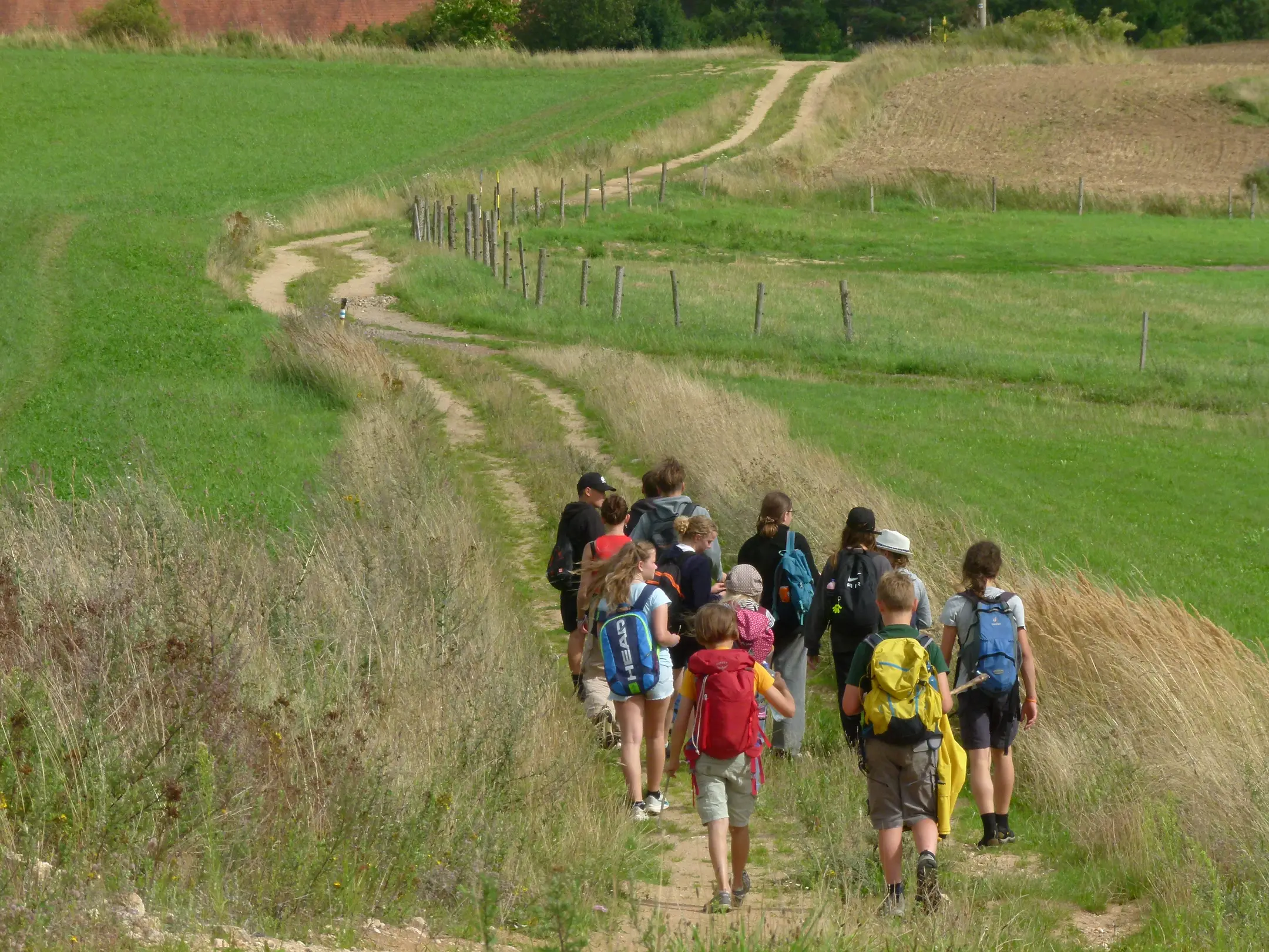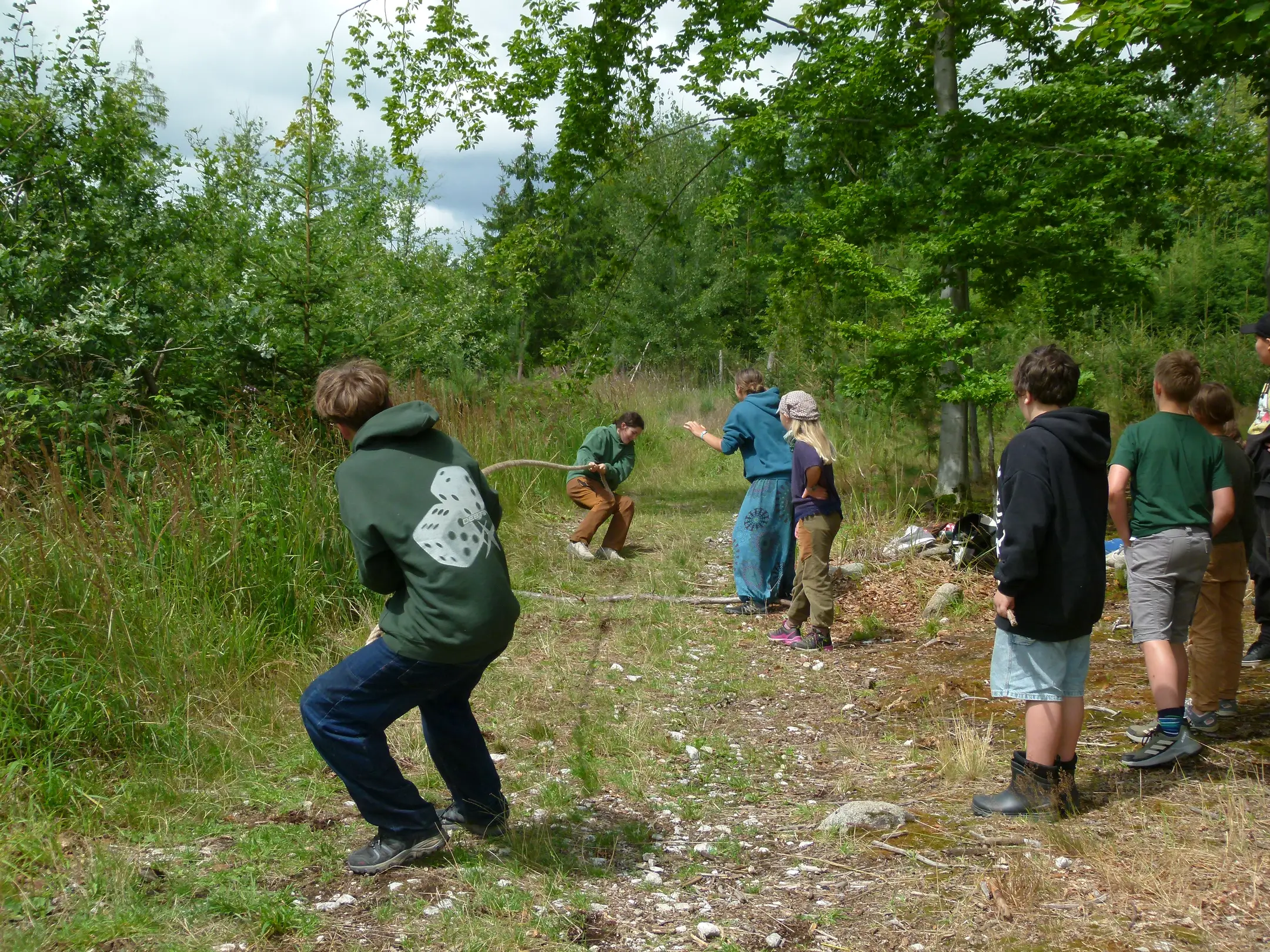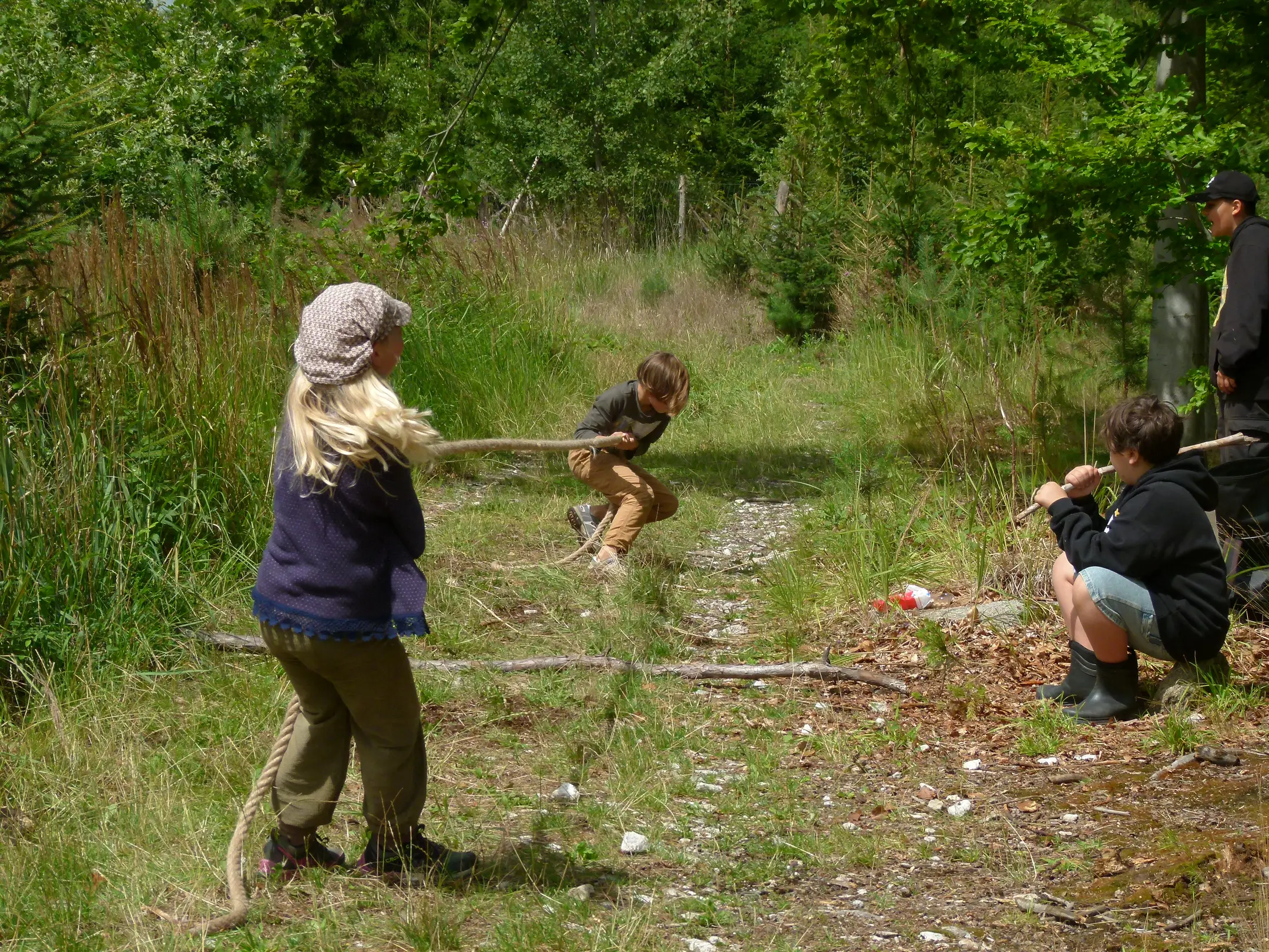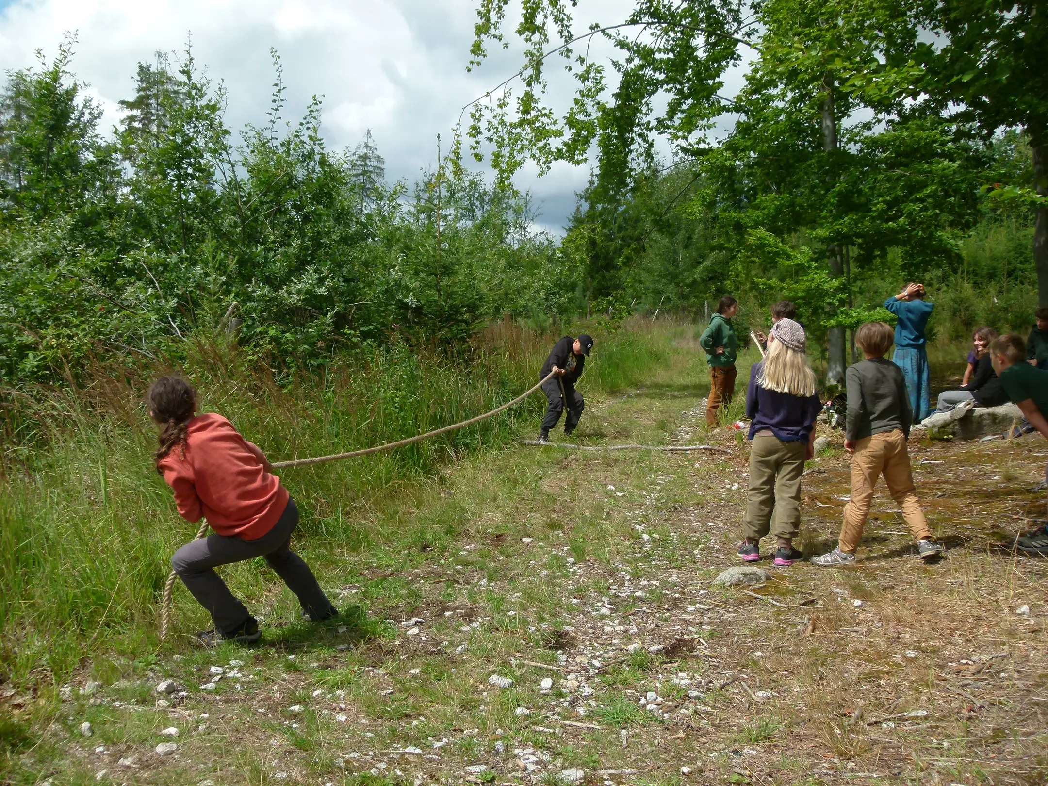 Am darauffolgenden Tag wanderten wir zu zwei verschiedenen Felssteinen. Unterwegs gab es leckeres Eis, aber auch einigen Ärger mit Wäscheklammern, die einem beim Heimkommen Unglück beschert hätten. In einem lichten Buchenwald maßen wir unsere Kräfte beim Tauziehen bei endlich mal sonnigem Wetter.