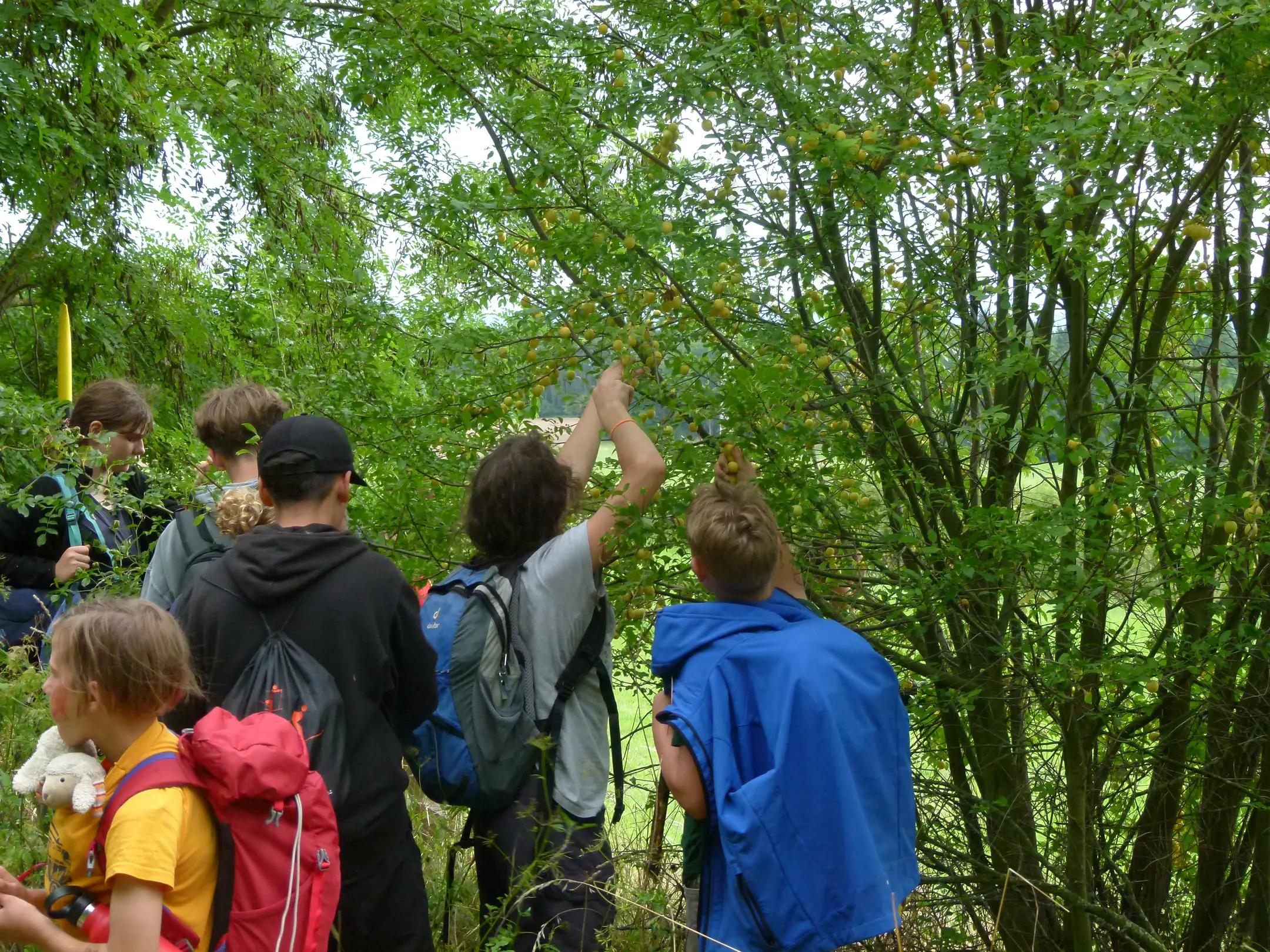 Am großen Wandertag danach gab es vormittags das ersehnte Badewetter. Das Wasser war recht kühl, aber eine Erfrischung kam allen gelegen. Gerade als der letzte noch im Wasser war begann es schon wieder zu tröpfeln und so packten wir eilig zusammen, um uns auf den Heimweg zu machen. Glücklicherweise war die Rückwanderung dann doch noch trocken. Die Busse fuhren allerdings so selten, dass wir nur eine Haltestelle fahren konnten. Unterwegs gab es vereinzelt schon süße, reife Mirabellen zu naschen. Die gefundenen Pilze (Riesenbovist) landeten nach der Heimkehr in der Pfanne und wurden noch ergänzt mit barfuß aus den Brennnesseln gefischten Parasolpilzen. Mit Hirse und pilzfreier Alternativsoße aßen wir das Abendessen wegen dem Dauerregen wieder in der Jurte.